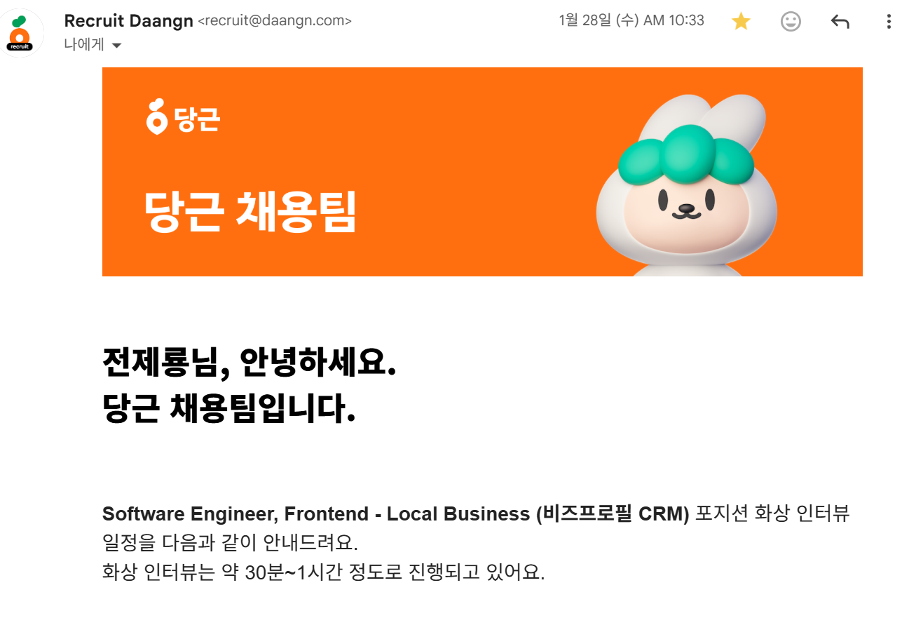 합격 메일을 읽으며 가장 먼저 느낀 건, 당근이라는 회사가 지원자를 대하는 태도였습니다. 화상 인터뷰가 어떤 내용으로 진행되는지, 어떤 방식인지, 일정은 어떻게 잡히는지를 친절하게 안내해주고 있었고, "사소한 질문도 환영해요"라는 문구에서 지원자에 대한 배려가 느껴졌습니다.
