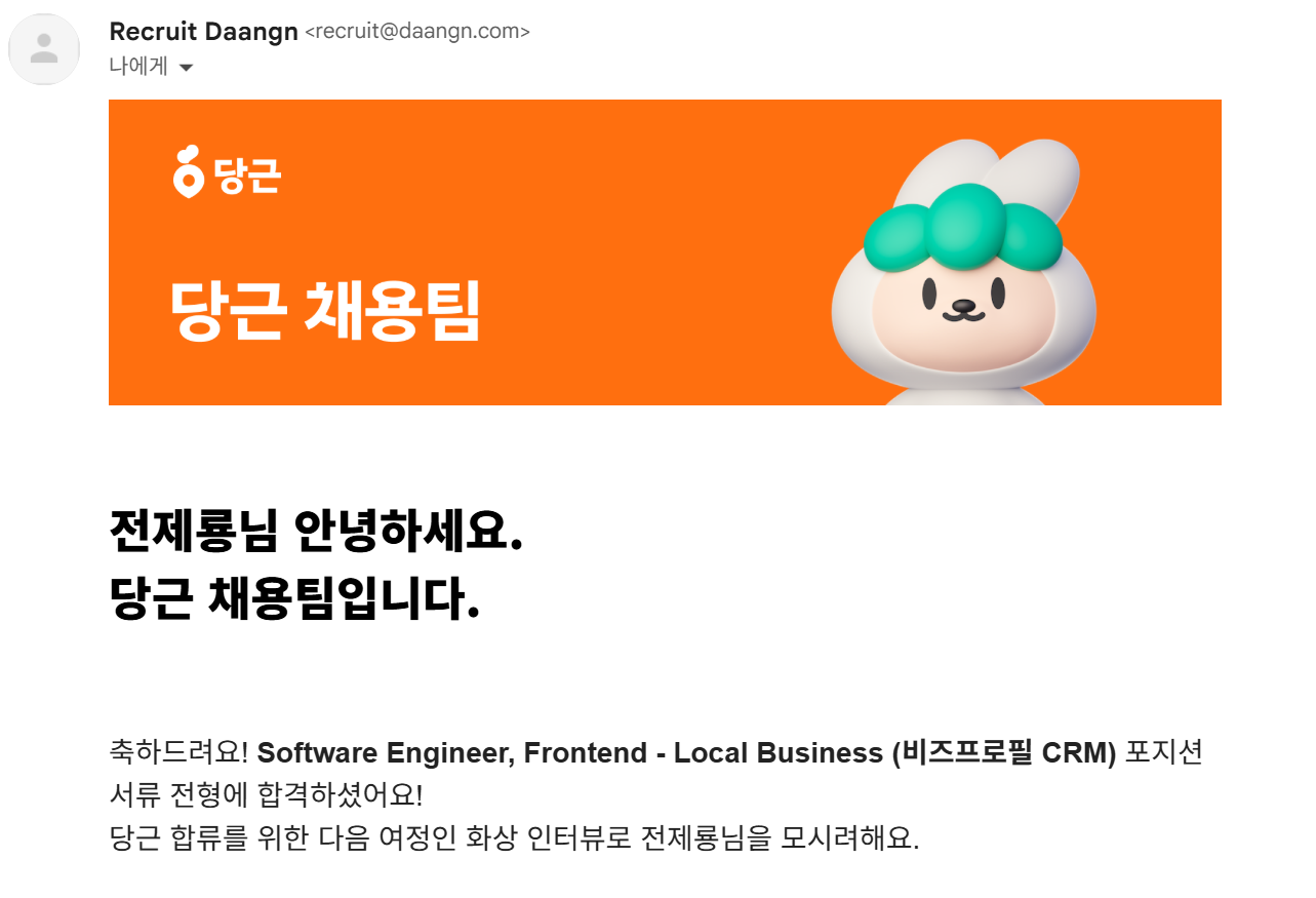 채용 과정 전체를 돌아보면, 당근은 서류 안내부터 불합격 통보까지 지원자를 존중하는 태도가 일관되게 느껴지는 회사였습니다.