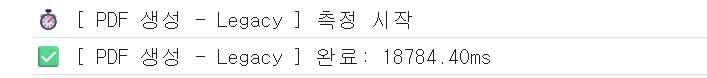 데드라인이 너무 가까워 "커스텀 PDF 프레임 규격 일치율 100%"를 최우선 목표로 정하고 안전성이 높은 방향으로 개발은 우선 완수했지만 안전성을 위해 구현했던 한 글자씩 넣으며 비교/계산하는 방식이 너무 많은 연산을 일으켜 Text 내용이 많아질수록 메인스레드에 부하가 커져 생성 완료까지의 시간이 너무 오래 걸린다는 문제가 있었습니다.