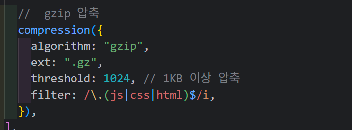 vite.config.js 파일에서 default객체의 plugins 배열에서 compression 함수를 추가하고 아래 이미지와 같이 설정해 주면 빌드 시 .gz 확장자를 가진 압출 파일이 동봉됩니다.