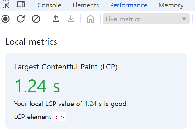 - LCP: [ 1.24s ➔ 0.58s ] - 약 2.1배 단축 ( 53.2% )