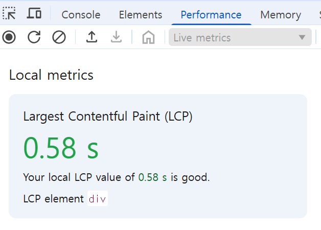 - LCP: [ 1.24s ➔ 0.58s ] - 약 2.1배 단축 ( 53.2% )