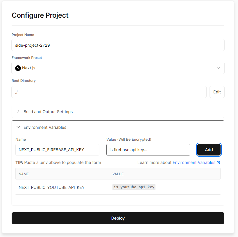 환경변수를 모두 Add를 눌러 추가하고 마지막으로 Deploy를 눌러주면 배포가 완료된다.