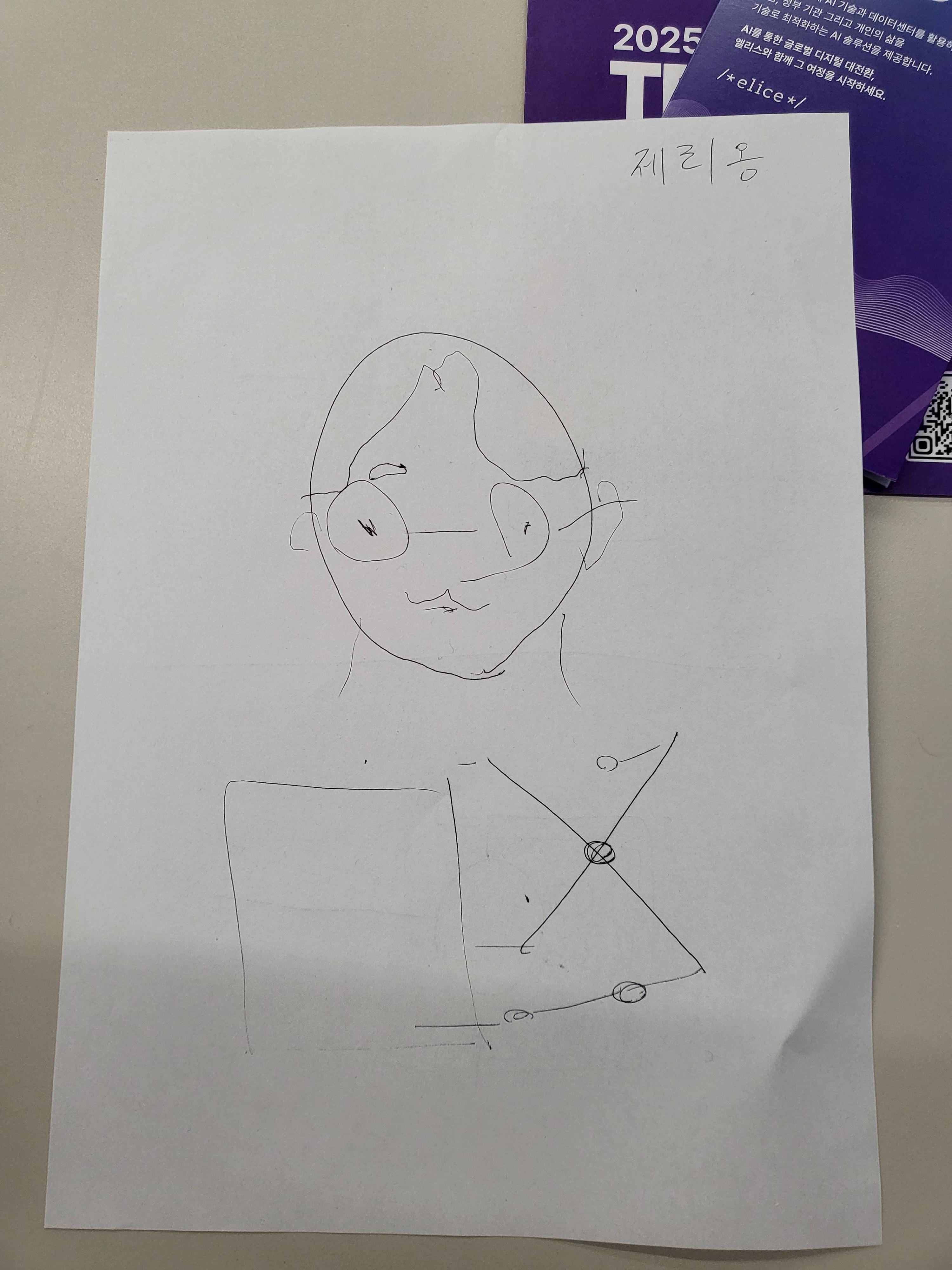 그리고 "팀원의 얼굴 그려주기 게임"을 진행한다고 해서 그림 그리기에 자부심이 있기 때문에 내심 "내 실력을 보여 줄 때로군!"라고... 생각했지만 방식이 조금 특이했습니다. 자주 쓰는 손이 아닌 반대 손으로 그림을 5초 동안 그린 후 시계방향으로 동료에게 넘겨주며 다 함께 그림을 만들어가는 방식이었습니다🥲
